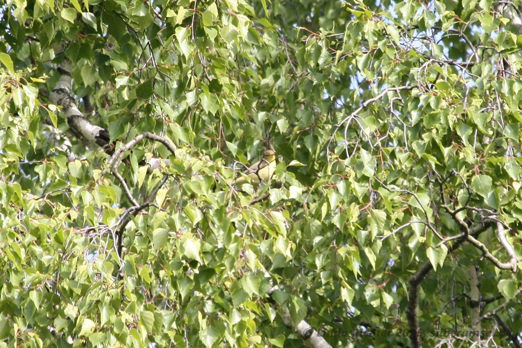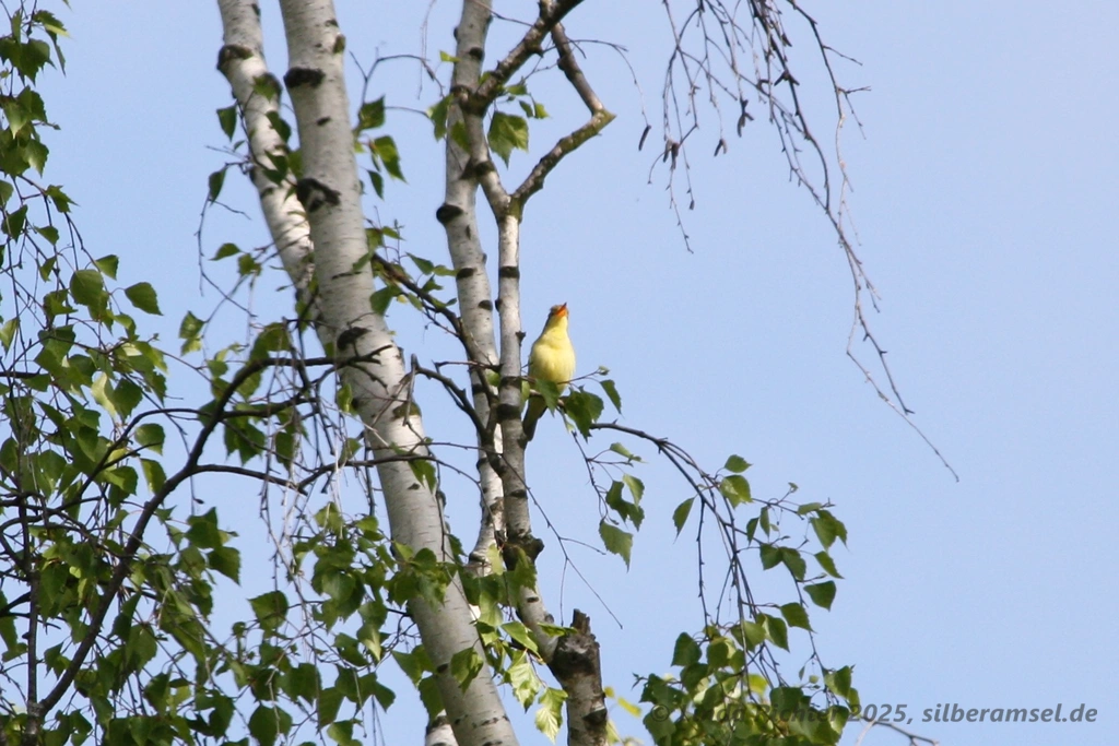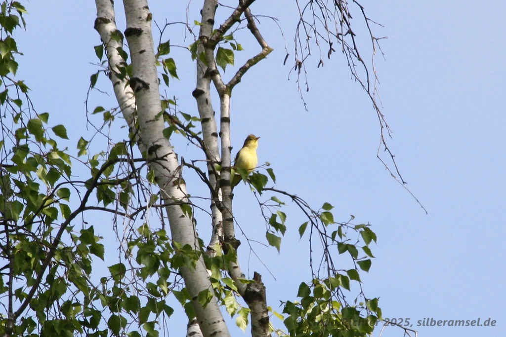 Da die Birken, in denen dieser Vogel saß, nicht so dicht belaubt waren, hatte ich den Verursacher relativ schnell ausgemacht und seine hellgelbe Bauchunterseite leuchtete mir entgegen. Und da es schönstes Sonnenwetter war, zückte ich meine Kamera und machte diese herrlichen Schnappschüsse: