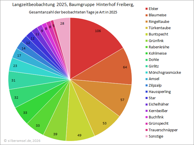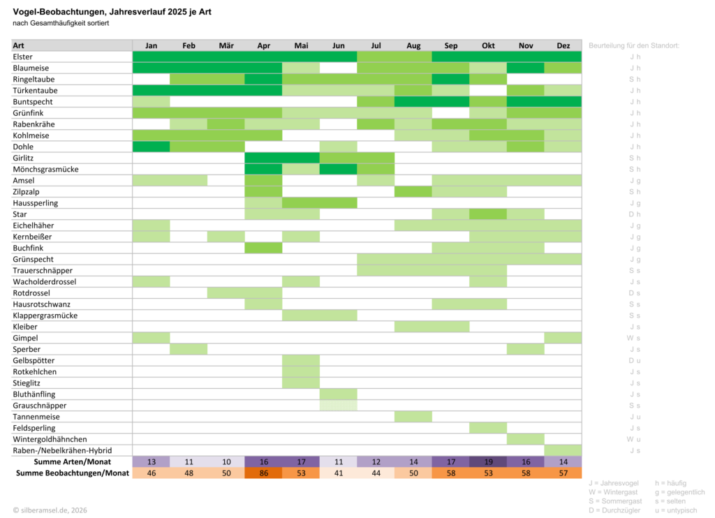 Hier nun die vollständige Liste aller in 2025 beobachteten Vogelarten in der Baumgruppe bei mir im Hinterhof in Freiberg:
