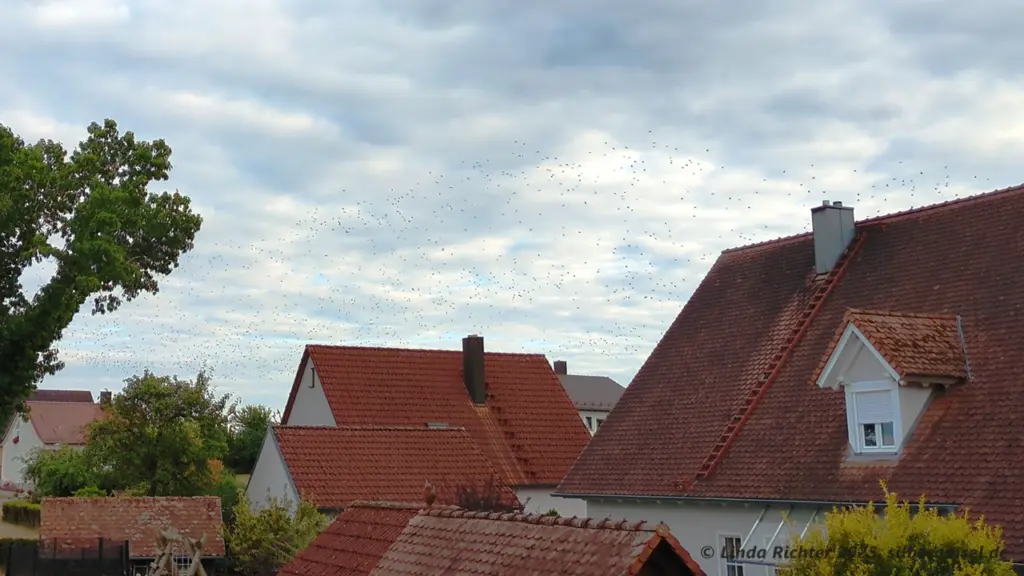 Doch wesentlich beeindruckender war das Erlebnis, was ich im Urlaub diesen Jahres erlebt hatte. In der Nähe befand sich der Altmühlsee, der mit seiner Vogelinsel und einem angrenzenden ausgedehnten Feuchtgebiet ein Vogelbeobachtungs-Hotspot im mittleren Bayern ist. Für die Stare war hier Anfang Juli die Brutzeit scheinbar schon zu Ende (was durchaus üblich ist: /1/) und so hatten sich in dieser Gegend bereits an manchen Abenden schon Unmengen an Stare gesammelt. Sie flogen in einiger Entfernung an unserer Ferienwohnung vorbei in Richtung dieser Feuchtgebiete, wo sich vermutlich viel Schilf befand, welches sie gerne als Schlafplatz nutzen /2/. Das folgende Bild soll mal einen Eindruck von ihrer Schwarmgröße verschaffen.