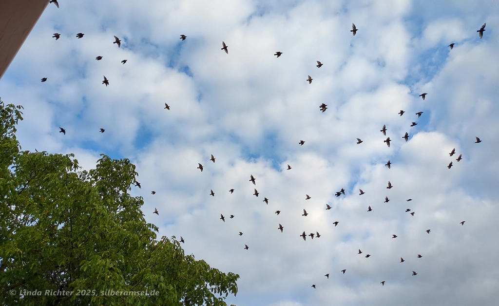 Daher war es nicht verwunderlich, dass Ende September bei uns in der Baumgruppe hinterm Haus plötzlich ein großer Trupp Stare eingeflogen kam. Es waren vermutlich um die 80 bis 100 Stück. Die haben einen ordentlichen Krach gemacht und durch ihr unruhiges Hin-und Hergewusel alle anderen Vögel im Umkreis verjagt. Hier mal eine kurze Kostprobe ihres Geplappers: