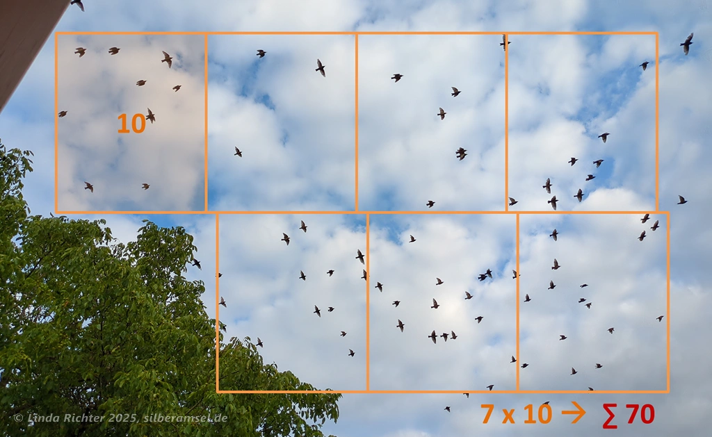 Mich würde es nicht wundern, wenn ihr euch genauso wie ich grandios verschätzt. Aber das ist halb so wild, Vogelschwärme abschätzen zu können, ist nicht so einfach, wie es klingt, und muss man üben.